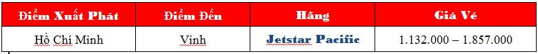 Hiện nay hành trình Hồ Chí  Minh đi Vinh được 3 hãng hàng không VietJet Air, Jetstar Pacific, Vietjet Air khai thác với giá vé và giờ bay khác nhau tạo điều kiện thuận lợi cho khách hàng.
