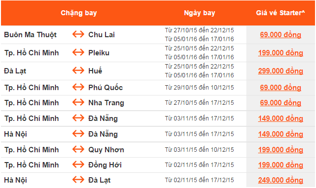 Giá vé một chiều, chưa bao gồm thuế, phí. Giá vé phụ thuộc tình trạng chỗ của chuyến bay và chỉ mở bán cho một số chuyến bay và ngày bay. Vé không được hoàn, hạn chế thay đổi, nếu thay đổi phải đóng phí. Không bao gồm Hành lý ký gửi. Các tiêu chuẩn về trọng lượng và kích thước của Hành lý xách tay sẽ được áp dụng. Hành khách mang Hành lý xách tay không đúng với quy định sẽ phải làm thủ tục ký gửi và phải đóng phí.