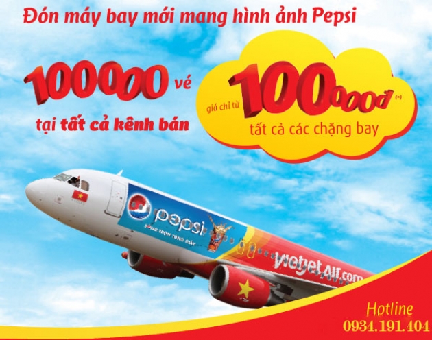 Tuần lễ vàng BAY khắp nơi chỉ từ 100.000đ Wow... Máy bay mới nhất A320 "Sharket" mang hình ảnh Pepsi đã về tới VietNam. Bạn không thể bỏ qua trải nghiệm bay thú vị cùng VietJetAir với tàu bay mới, ghế da êm ái, cùng 9 món ăn nóng ngon miệng và nhiều quà lưu niệm độc đáo. VietJet Air dành tặng bạn 100,000 đồng cho tất cả các chặn bay, từ ngày 7/11 đến 14/11/2013 tại tất cả các đại lý vé của hãng.
