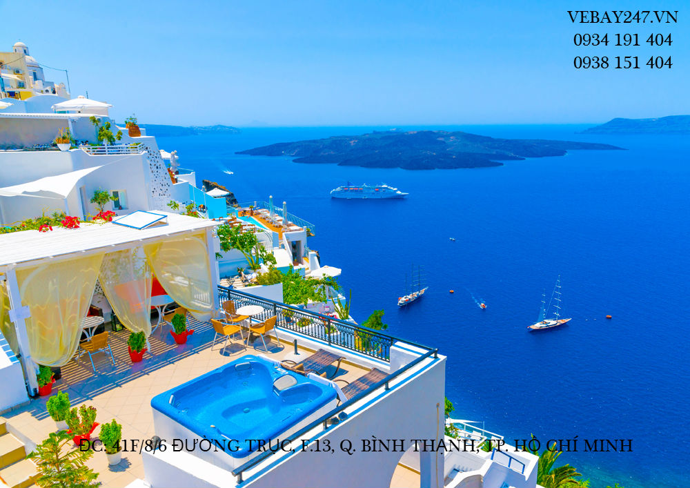 Đến hòn đảo được mệnh danh là “thiên đường tình yêu” nổi tiếng nhất ở Hy Lạp, du khách sẽ cảm nhận được rõ rệt ý nghĩa của từ biển xanh. Nằm cách Athens 300 km về phía Đông Nam, Santorini không chỉ sở hữu những ngôi nhà quét vôi trắng mái sơn xanh đẹp như cổ tích mà còn là nhà của miệng núi lửa nổi tiếng thế giới tọa lạc ở độ cao 300 m cùng những màu sắc tự nhiên khác.