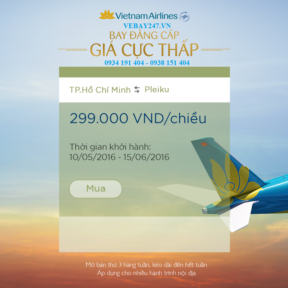 Đồng hành cùng chương trình "BAY ĐẲNG CẤP, GIÁ CỰC THẤP", của Vietnam Airlines trong tuần này, các bạn sẽ có cơ hội đặt được những tấm vé máy bay nội địa với giá chỉ 299.000đ/chiều. Vé giá rẻ chỉ được mở bán vào thứ 3 hằng tuần!, vì vậy các bạn hãy nhanh tay lên nhé