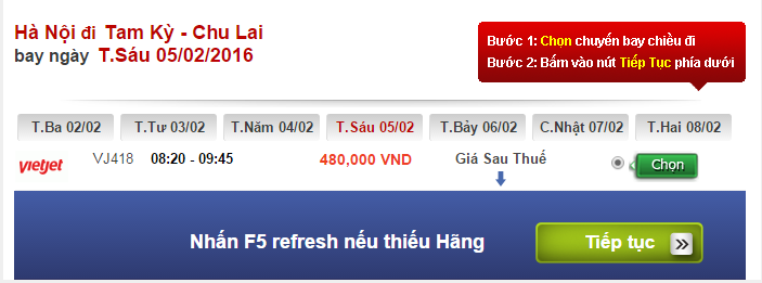 Theo ghi nhận của Vebay247, ở thời điểm hiện tại trên hành trình Hà Nội – Tam Kỳ một số ngày cận Tết hãng hàng không Vietjet dành được sự chú ý đặc biệt với loạt vé máy bay giá chỉ 480.000 đồng trong ngày 05/02 (tức ngày 27 tháng chạp âm lịch), chuyến bay lúc 8h20. Đây cũng là chuyến bay duy nhất còn vé trong ngày này.