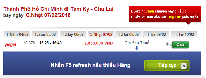 Đối với hành trình Tp Hồ Chí Minh – Tam Kỳ hiện tại giá vé máy bay Tết đang giữ ở mức khá cao. Trong ngày 04/02 giá vé được Vietjet đưa ra là 2.050.000 đồng. Ngày 05 và ngày 06 hiện đã hết vé.   Đến ngày 07/02 vẫn còn vé 2.050.000 đồng cho chuyến bay lúc 15h25 của hãng hàng không Vietjet.