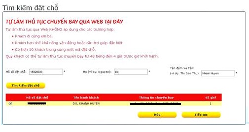 Bước 3: Lúc này, hệ thống sẽ hiển thị thông tin hành khách. Nếu mã đặt chỗ chung cho nhiều người, bạn làm như sau: Gõ mã đặt chỗ và điền tên khách thứ nhất, check-in xong, bạn quay lại từ đầu để điền tên người thứ hai. Khi đã kiểm tra thông tin, bạn đánh dấu vào ô Chặng bay. Trường hợp vé khứ hồi, bạn chọn chuyến cần check-in sau đó nhấn Tiếp tục.