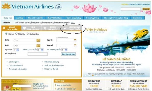 Bước 1: Bạn truy cập vào website: www.vietnamairlines.com, chọn ngôn ngữ tiếng Việt, sau đó, ấn vào tab "Làm thủ tục trực tuyến" tại khu vực đặt vé.