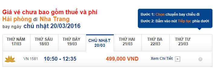 Truy cập website: http://vebay247.vn/ lựa chọn hành trình và khung thời gian bay ưng ý và tiến hành các thao tác đặt vé máy bay như thông thường.