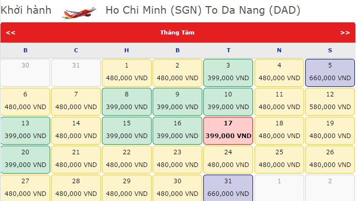 Theo hệ thống Vegiasoc.com cập nhật, vé máy bay Sài Gòn – Đà Nẵng tháng 08/2016 đang sở hữu rất nhiều mức giá hấp dẫn. Hiện mức giá hấp dẫn nhất ở hành trình này là 399.000đ của hãng hàng không Vietjet vé xuất hiện vào khá nhiều ngày bay như 8, 9, 10… Nếu nhanh tay bạn có thể là chủ nhân của những tấm vé này.